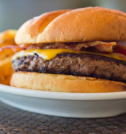 CHEDDAR CHEESE, APPLEWOOD BACON, TWO CRISPY ONION RINGS.
